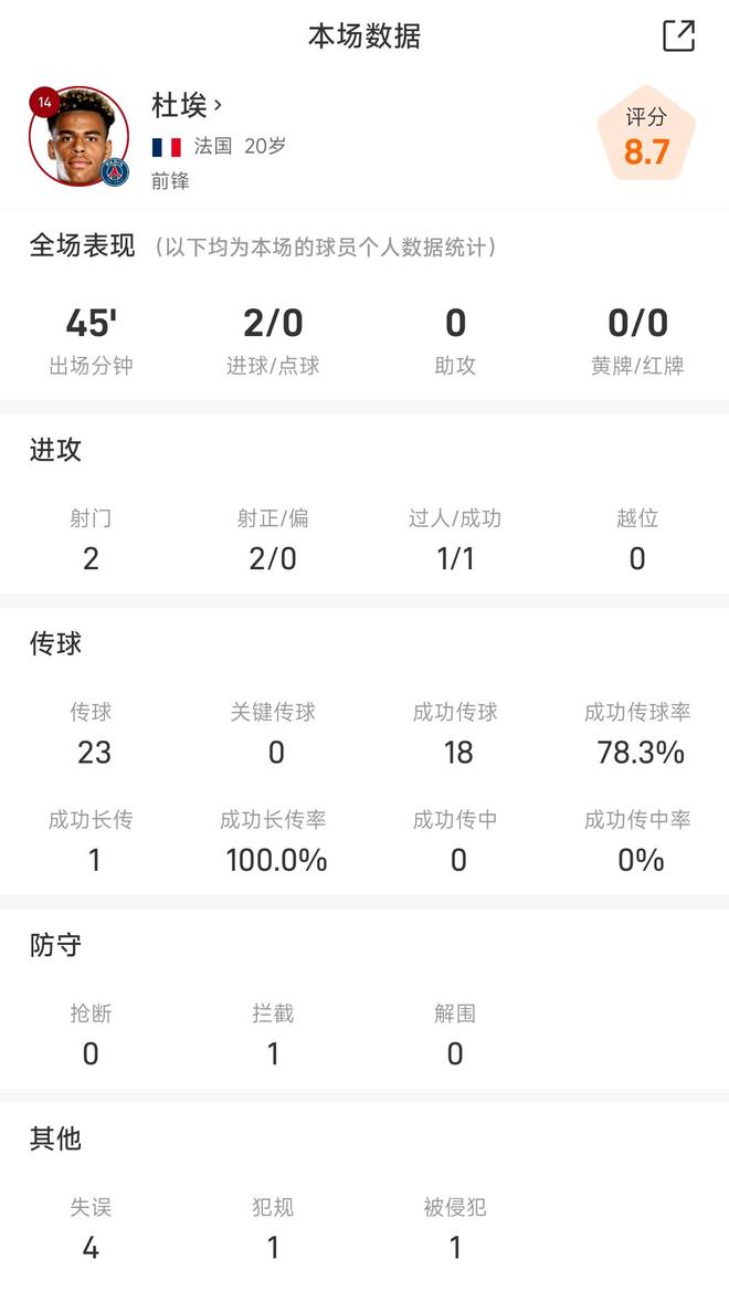 雷速体育10月22日讯 在今天凌晨结束的巴黎客场7-2狂胜勒沃库森的欧冠比赛中,杜埃在上半场便梅开二度。